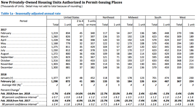 Building permits fell 5.7% from January to a seasonally adjusted annual rate of 1,298,000, still 6.5% above the February 2017 rate of 1,219,000. Single-family authorizations fell 0.6% to a rate of 872,000 but remained 4.6% ahead of the same month last year. Authorizations of units in buildings with five units or more were at a rate of 385,000 in February, down 14.8% from January but up 13.2% from a year earlier.