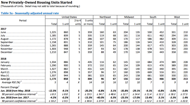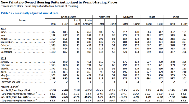 Building permits also were down in June, falling 2.2% from May and 3% year-over-year to a seasonally adjusted annual rate of 1,273,000. Single-family authorizations in June were at a rate of 850,000, 0.8% above the revised May figure of 843,000.
