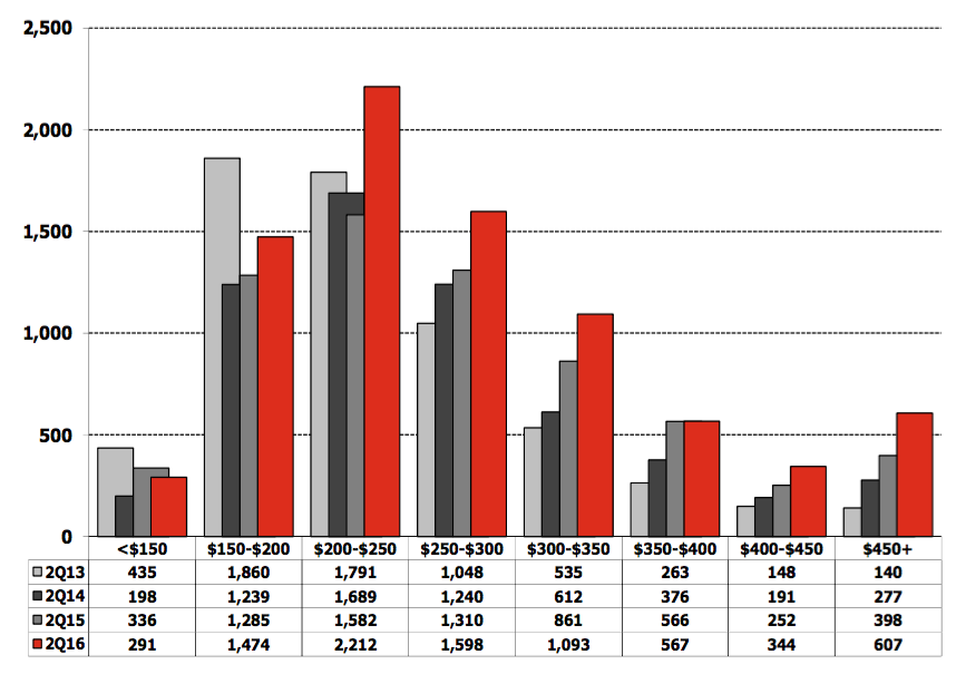 For the twelve months ending June 2016, annual new home starts in price ranges under $200K totaled 1,766 units, up 9% from 2Q15. New home starts in prices over $200K grew by 29.2% to 6,425 units as of 2Q16 compared to 2Q15. The marginal 1,598-unit increase in the annual start pace was split: 145 more units under $200K and 1,453 more units above $200K.