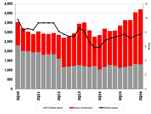 In 2Q16, total single-family inventory – units under construction, finished vacant and models – equaled 4,647 units on the ground, a 7.7-month supply. Inventories grew by 24.5% compared to 2Q15. Compared to last year, the number of units under construction rose by 677 homes to 2,899 homes. Finished vacant inventory increased by 16.2% from 1,122 units last year to 1,304 this year. Compared to a year ago, the FV months of supply held steady at 2.2 months. However, the number of move-ins exceeded completions during the quarter and FV inventory fell by 24 units versus 1Q16 but months of supply was steady 2.2 months.