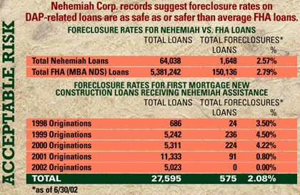 Nehemiah’s reputation gained traction in 2002 when it formed a strategic alliance with Homebuilders Financial Network (HFN), the Miami Lakes, Fla., backend mortgage origination provider to 31 national and regional builders. Now reportedly among the top five largest originators of new home loans in the country, HFN’s group generates $8 billion in home sales. Under the terms of the alliance, Nehemiah offers down-payment assistance to buyers interested in homes built by their partners. However, only eight HFN builders qualify for FHA loan activity–a prerequisite for DAP.