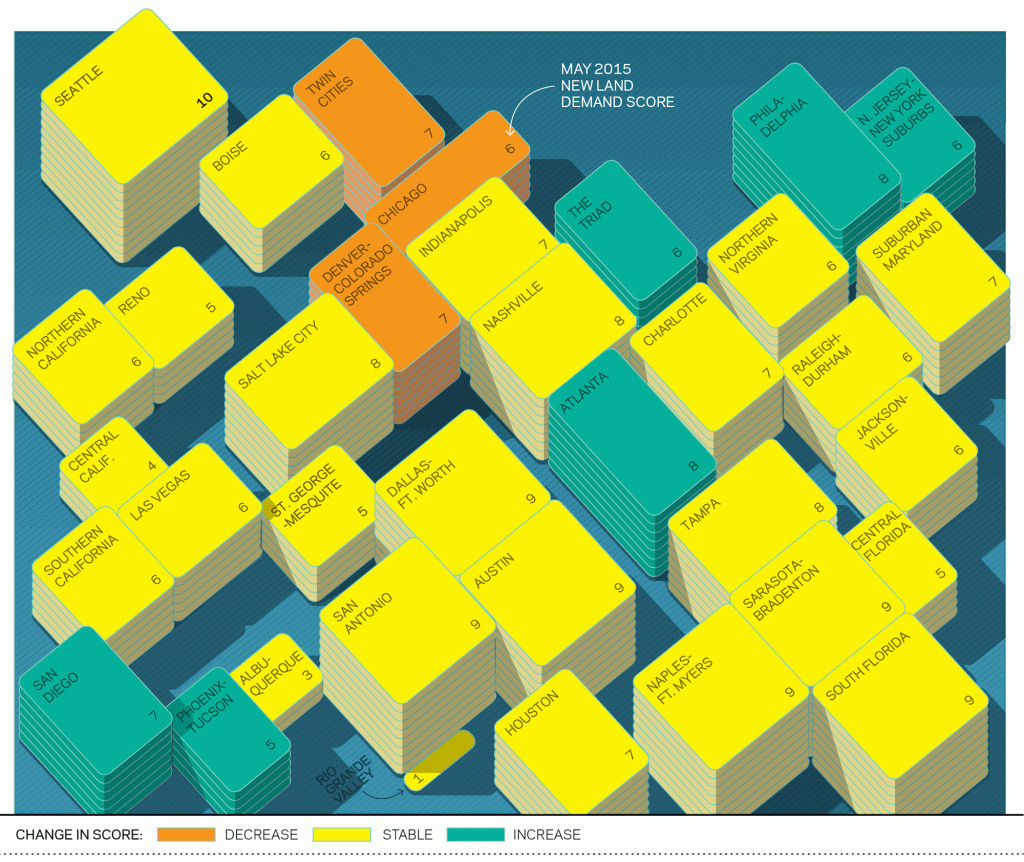 Despite a high reading of “8” in the Denver market for the past three months, regional director John Covert reports that lot demand there has checked up a bit during May, and lot deliveries are now outpacing starts. “Lots that builders acquired over the last 36 months are finally hitting the market with new stores,” he adds, “so demand has leveled off somewhat.”