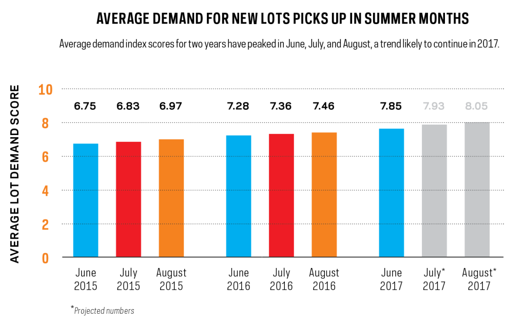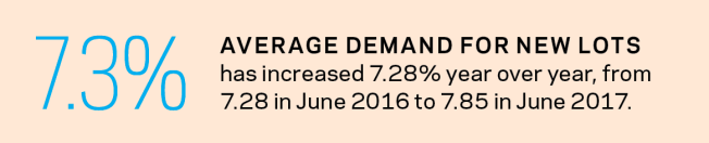 Builders are looking to secure land for 2018, now that spring selling season is over. Average demand for new lots across Metrostudy’s 36 markets peaked in June, July, and August the past two years. While some builders look to acquisitions in order to secure lots—like D.R. Horton’s acquisition of publicly held mixed-use developer Forestar Group in June, which landed it roughly 9,700 lots in 14 U.S. markets—builders in other markets with tight lot inventory must employ other strategies.