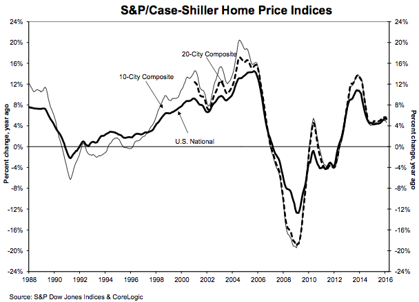 According to the S&P/Case-Shiller U.S. National Home Price Index released Tuesday morning, price appreciation of existing single-family homes continued in February, but at a slower rate than seen in recent months.