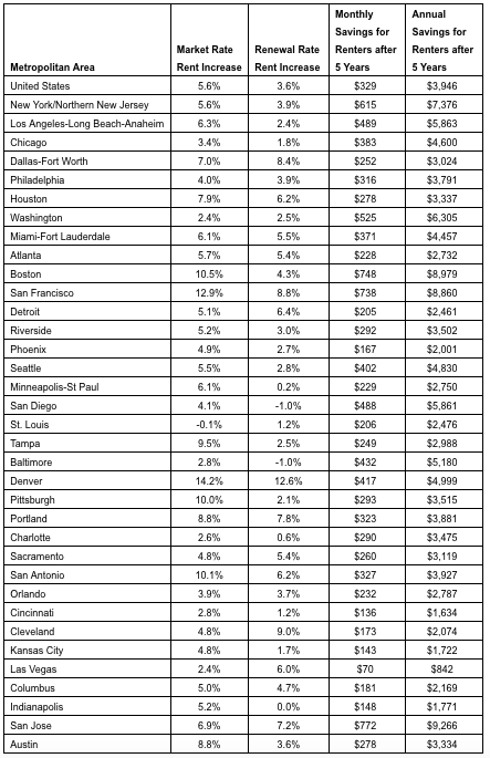 In Boston in particular, it paid off for renters to stay in the same place instead of moving every year. Boston renters saved up to 86% by staying in the same rental for five or more years, which translated to $8,979 in annual rent payments. They also faced the biggest difference between annual market rate rent increases – 10.5% – and rent increases for renewing – 4.3%.