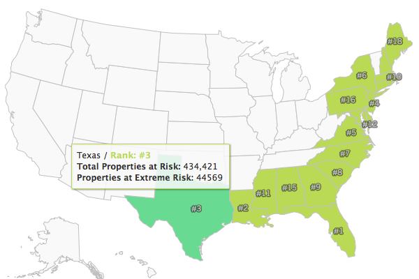CoreLogic’s 2014 Storm Surge Report estimates the number of single-family homes exposed to storm surge damage as a result of hurricanes, as well as the estimated cost of reconstruction. Our interactive map breaks out one section of the report–top states with the most homes at risk for damage.
