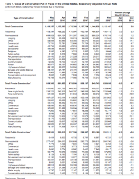 Spending on private construction was at a seasonally adjusted annual rate of $859.3 billion, 0.3% below the revised April estimate of $861.9 billion. Residential construction was at a seasonally adjusted annual rate of $451.9 billion in May, flat with the revised April estimate of $451.7 billion. Nonresidential construction was at a seasonally adjusted annual rate of $407.4 billion in May, 0.7% below the revised April estimate of $410.1 billion.