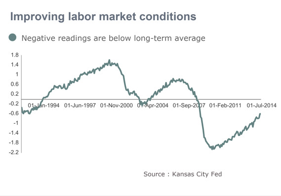 The Kansas City Fed said its labor-market activity indicator in July rose to its highest level since October 2008, as momentum was the strongest since May.The indexes, which are based on 24 labor-market variables, have taken on importance after Federal Reserve Chairwoman Janet Yellen cited the Kansas City Fed research in her speech in Jackson Hole, Wyo. and said a good way to measure labor-market progress is to look at factor models like this one.