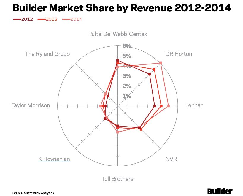All eight of these top 200 builders closed at least 1,000 new homes from 2012 through 2014 so far to buyers with a household income above $180,000. All have maintained relatively steady revenue market share throughout the last few years, with six of the eight seeing a year-over-year revenue market share climb from 2012 to 2014, despite an overall disappointing year for home sales in 2014. These featured big builders are increasing home sales to the 1 percent while affordability continues to keep out millennial buyers, but big pay days are definitely alleviating some of the potential damage to revenue.