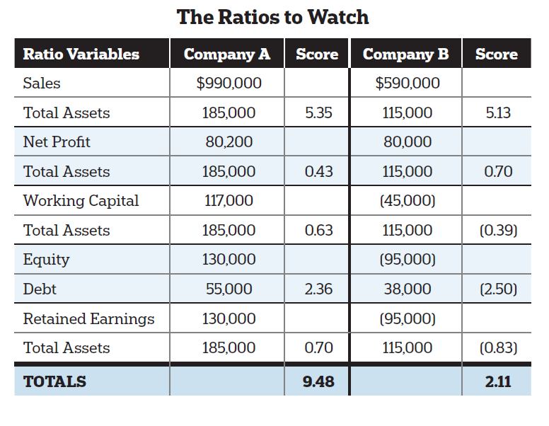 As you can see in the example below, a higher total score is better. Company B’s strong performance in Sales and Net Profit is, however, dragged down by too much debt, negative working capital and retained earnings, poor cash flow, and no savings. This is a difficult position to overcome, but it’s not impossible. Knowing what the problems are is the first step to recovery.