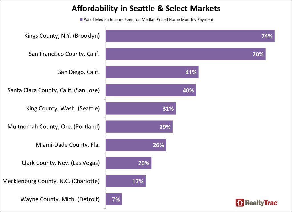 As RealtyTrac chief economists Daren Blomquist takes a look at Seattle’s booming population- it was recently ranked the fastest growing big city in 2013 by the U.S. Census Bureau–he logs in on some the least-, and most-affordable markets in the country.