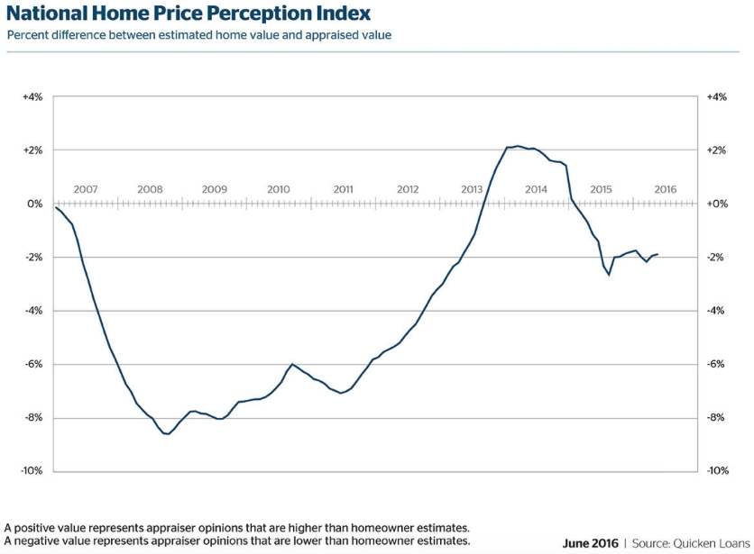 Quicken Loans on Tuesday reported home appraisals in May were an average of 1.89% lower than what homeowners were expecting, according to the national Home Price Perception Index (HPPI).