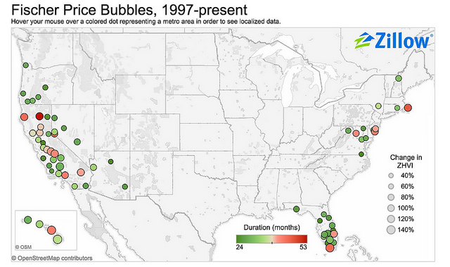 Zillow analyst Aaron Tarrazas looks at metro areas that have experienced [Federal Reserve Governor Stanley] Fischer Price Bubbles between 1997 and the present. Tarrazas notes that no metro areas currently meet the criteria of a Fischer Price Bubble, but eight metro areas are approaching that threshold for the number of consecutive months of annual home value increases in excess of 16%.