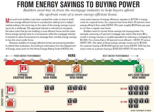 That, of course, would entail building to energy-efficient standards and making those standards, well, standard. That would force builders to learn how to amortize the additional costs of building a higher-performance home. The way to do that is to build to a level of energy efficiency where the cost to the homeowner in terms of additional monthly mortgage costs is, if not totally off set, at least significantly off set by the money the homeowner would save on monthly energy bills.