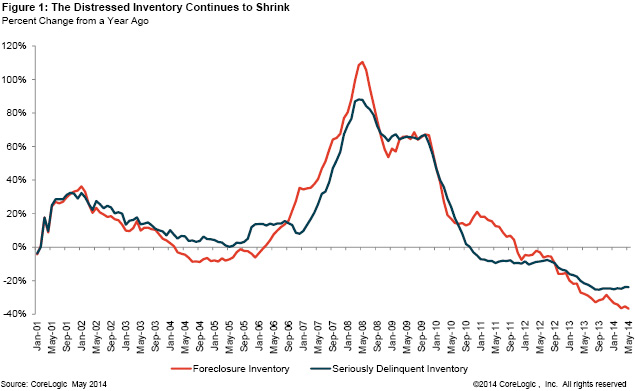 CoreLogic’s Sam Khater looks at the drop in national foreclosure inventory by 37% in May 2014 to approximately 660,100 homes, or 1.7% of all homes with a mortgage, from 1.0 million, or 2.6%, in May 2013.