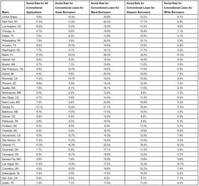 Zillow noted that even though a smaller share of loan applicants overall are denied, white or Asian borrowers are more likely to be approved for a mortgage than black or Hispanic borrowers. In 2016, 8.1% of white applicants were denied for a conventional loan, as were 10.4% of Asian applicants. By comparison, 20.9% of black borrowers and 15.5% of Hispanic borrowers were turned down for a loan.