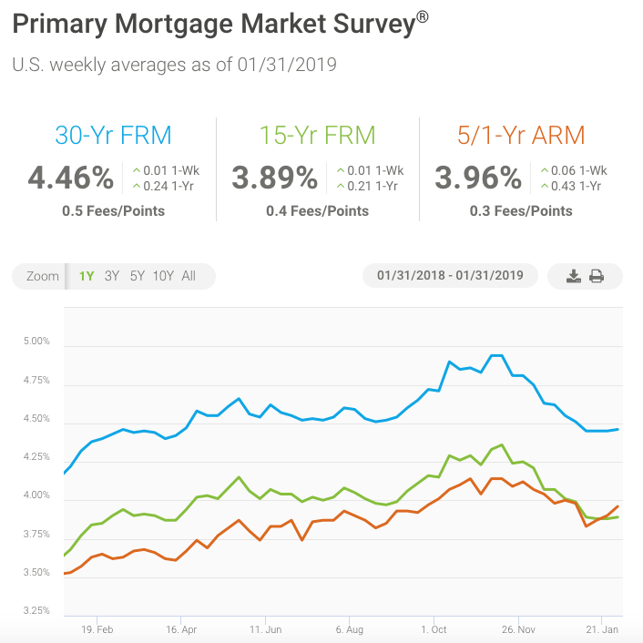- 30-year fixed-rate mortgage (FRM) averaged 4.46% with an average 0.5 point for the week ending January 31, 2019, up from last week when it averaged 4.45%. A year ago at this time, the 30-year FRM averaged 4.22%.