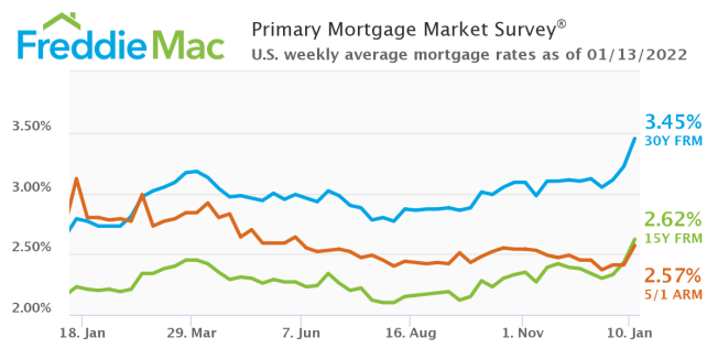 The 30-year fixed-rate mortgage (FRM) averaged 3.45% for the week of Jan. 13, up from 3.22% last week, according to Freddie Mac’s weekly Primary Mortgage Market Survey. A year ago at this time, the 30-year FRM averaged 2.79%.