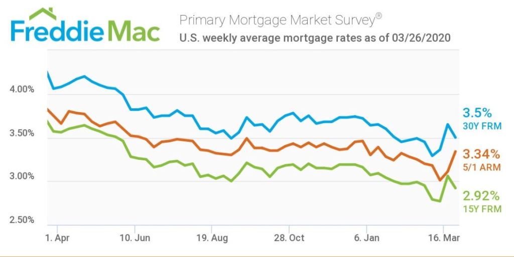 • 30-year fixed-rate mortgage averaged 3.50% with an average 0.7 point for the week ending March 26, 2020, down from last week when it averaged 3.65%. A year ago at this time, the 30-year FRM averaged 4.06%.