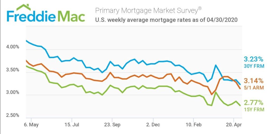 - 30-year fixed-rate mortgage averaged 3.23% with an average 0.7 point for the week ending April 30, 2020, down from last week when it averaged 3.33%. A year ago at this time, the 30-year FRM averaged 4.14%.