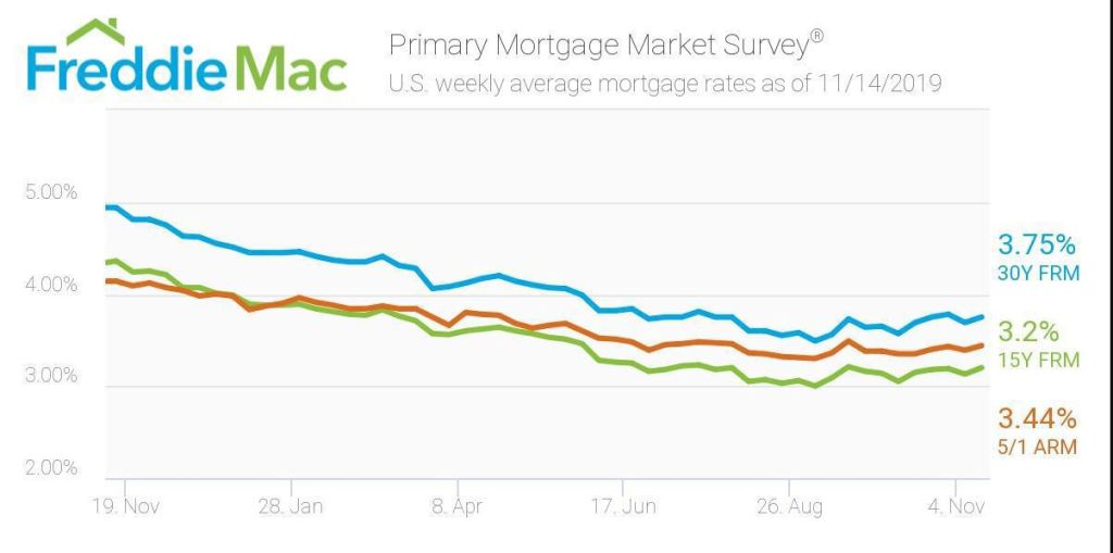 - 30-year fixed-rate mortgage averaged 3.75% with an average 0.6 point for the week ending November 14, 2019, up from last week when it averaged 3.69%. A year ago at this time, the 30-year FRM averaged 4.94%.