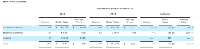 Home sales revenue for the 2019 fourth quarter was down 7% from the 2018 fourth quarter at $173.9 million compared to $187.3 million in the year ago period. The decrease in home sales revenue was driven by a 13% decline in average selling price to $870,000 from $1.0 million for the 2018 fourth quarter, which was partially offset by a 7% increase in home deliveries. The lower year-over-year average selling price was impacted by mix, particularly in Northern California where 2019 fourth quarter average home price was down 20% due to a shift from higher-priced Bay Area communities to more affordable communities within the Sacramento region, which was partially offset by the addition of Arizona deliveries where the average selling price exceeded $1.0 million.