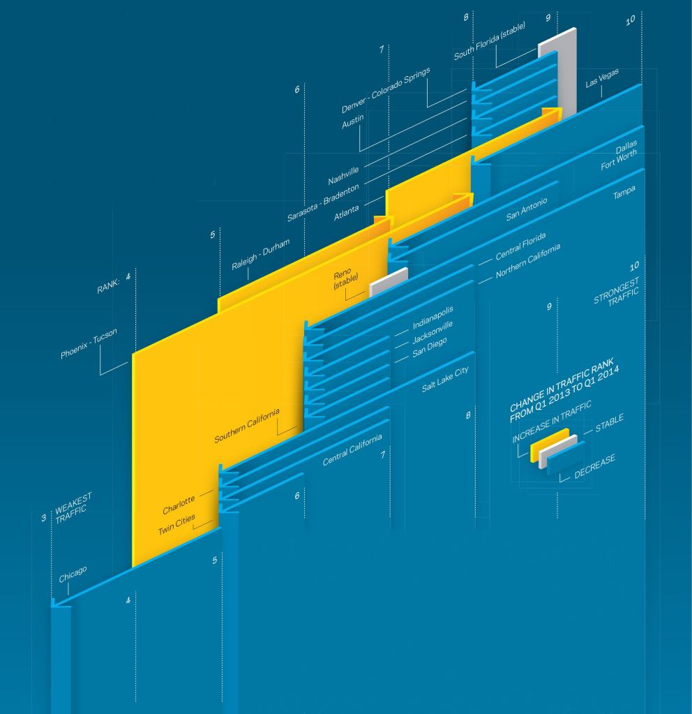In June, BUILDER released the first Demand Index from Metrostudy’s regional directors, which ranks demand levels for new homes and new home building lots across the U.S. Metrostudy also collects data on traffic from builders nationwide, which can identify patterns and trends. We asked the directors for insight on buyer traffic—how many potential buyers visit sales offices in each market. On a scale of 1-10 (1 low, 10 high), they compared traffic in their markets from the first quarter of 2013 to the first quarter of 2014. The scores show a decrease in traffic year-over-year from 2013 to 2014, with an average score of 7.3 (2013) and 6.4 (2014). In select markets like South Florida and Houston, traffic held strong year-over-year, and improved most significantly in Arizona’s Phoenix-Tucson market, jumping from a score of 4 to 8. “All builders [in the Phoenix market] feel the traffic is strong, but they are not converting into sales for the builders,” says Rachel Cantor, regional director of the Phoenix-Tucson market. Most regional directors concurred on lower traffic, but low sale conversions resonate across many of the markets, regardless of score. Price increases and mortgage rate increases continue to daunt prospective buyers, but the good news is that people are still looking.