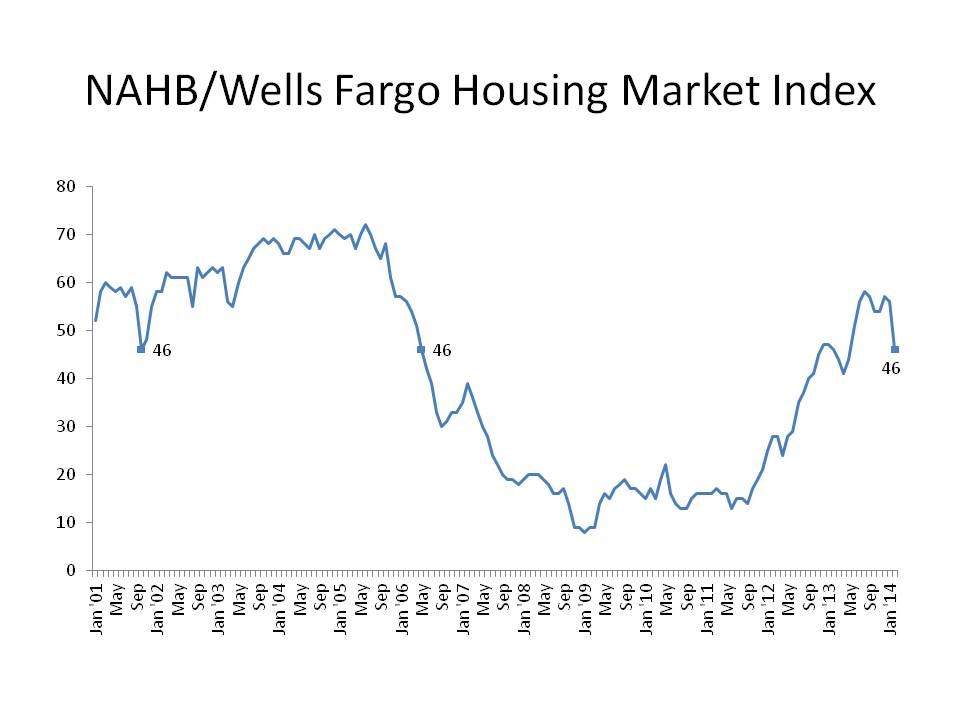 NAHB says brutal winter weather and shortages of labor and land caused the annual pace of housing starts to fall 16% month-over-month to 880,000 units in January. And it cites the same reasons for the 10-point drop (the biggest in 30 years) in its Housing Market Index (see chart), which gauges builder sentiment about the state of the market.