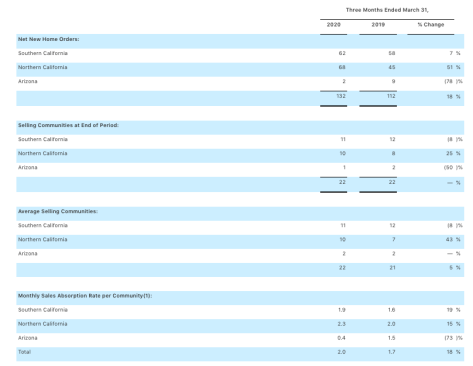 Net new home orders for the 2020 first quarter increased 18% primarily due to improved monthly sales absorption rates during the first two months of the quarter, and to a lesser extent, a slight increase in average selling communities. The monthly sales absorption rate was also up 18% to 2.0 for the 2020 first quarter as compared to 1.7 for the prior year period. Absorption rates were solid during the first two months of the 2020 first quarter, but were adversely impacted by the COVID-19 pandemic in the second half of March, where our monthly net orders decreased 28% for the month of March as compared to the prior year. We ended the 2020 first quarter with 22 active selling communities, flat with the prior year.
