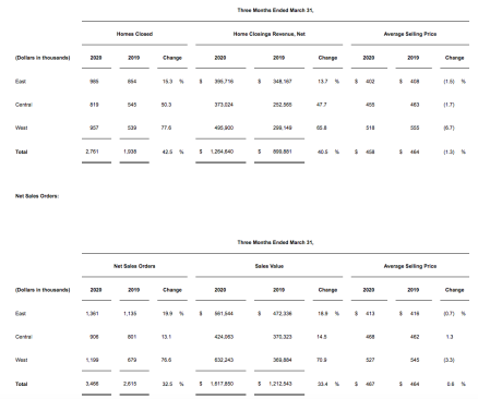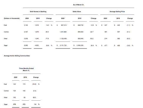 “When looking at the buildup of sales through the quarter, you can easily see the impact of the COVID-19 restrictions that began in mid-March,” added Palmer. “Consistent with most of the industry, our sales orders in the first two months of the year started extremely strong with January sales up 46% compared to the same period last year and a pace of 3.2. February sales were up 64% with the pace increasing to 3.5 and continuing into the first half of March. However, the last 10 days of March were slower with a deceleration in the sales pace to 2.5 as our team and the broader market adjusted to our new reality.”