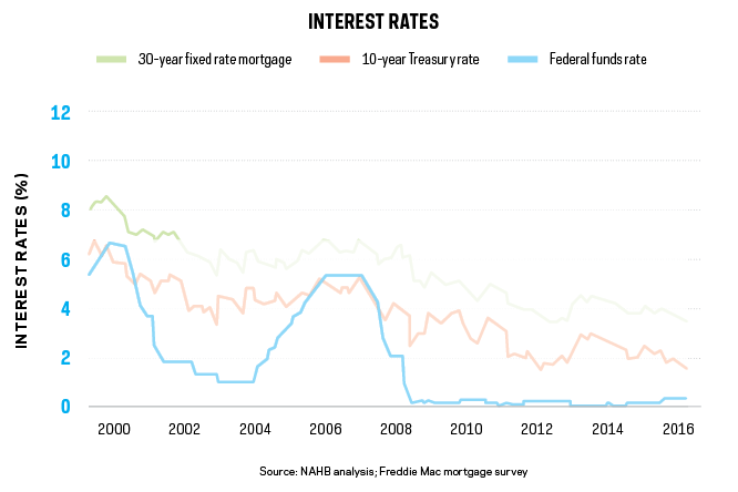 The economics team at NAHB previously had forecasted two rate hikes in 2016. However, given low GDP growth for the last quarter of 2015 (0.9%) and the first two quarters of 2016 (0.8% and 1.4%), the Fed held back on raising rates through the first half of the year. As such, NAHB forecasts that the next increase will occur at the December meeting.