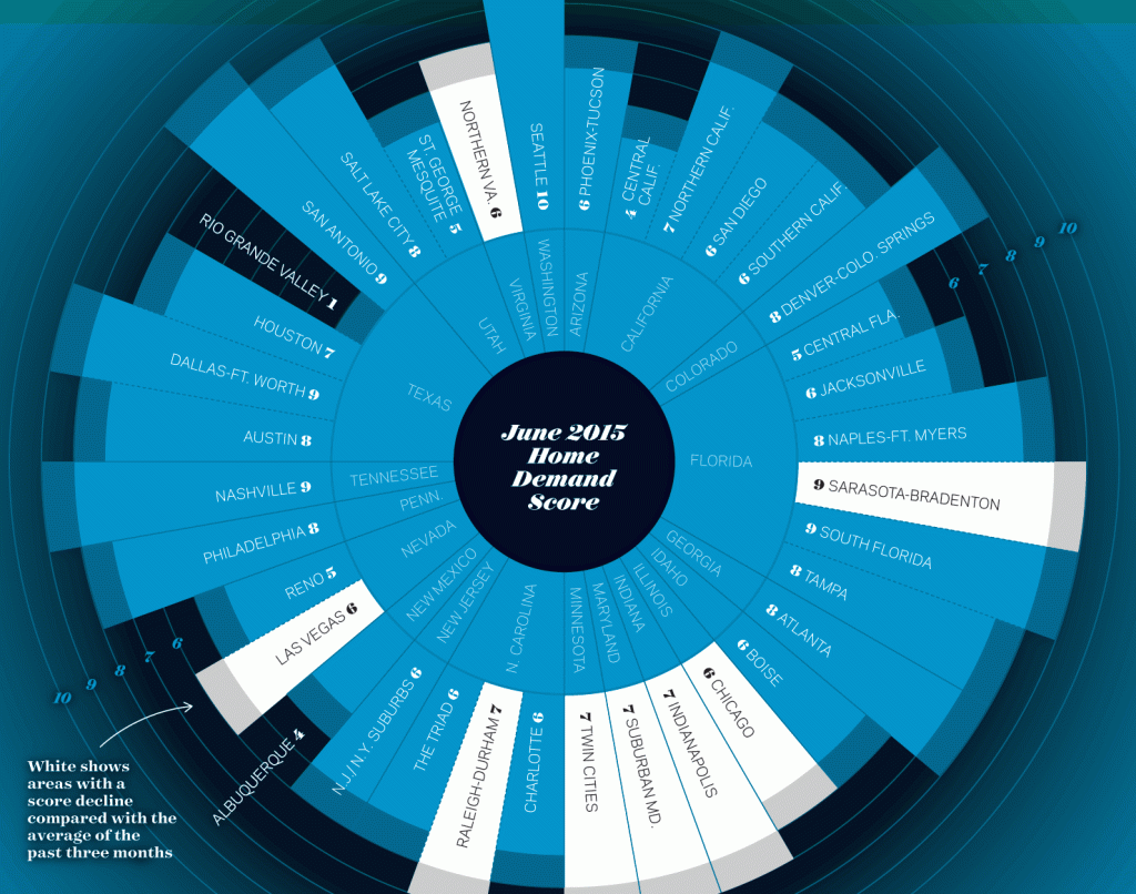 In Salt Lake City, traffic and home sales were strong in June despite the normal slowdown; resale and new construction sales in Seattle remain strong; and demand for all types of housing is high in Denver. These three markets were among seven that received a score for new-home demand in June that was higher than their three-month composite score.