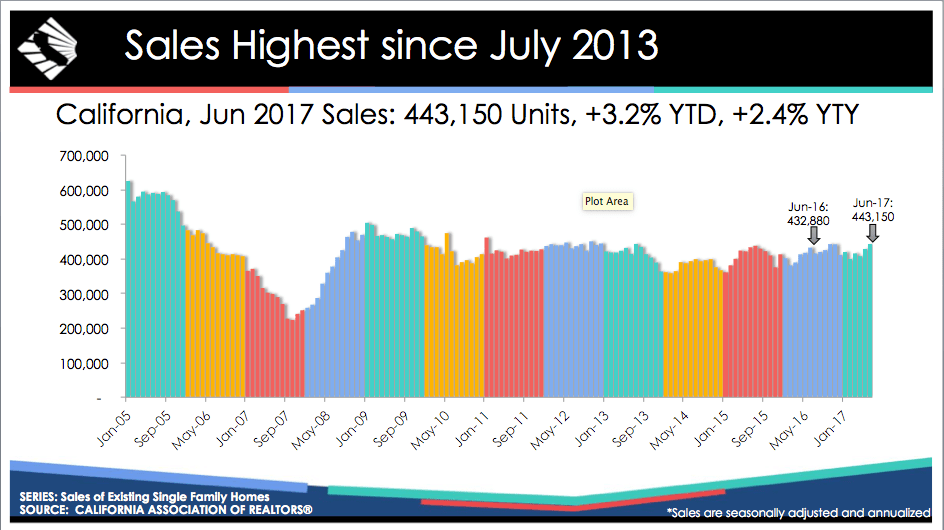 Closed escrow sales of existing, single-family detached homes in California not only remained above the 400,000 benchmark for the 15th consecutive month, they totaled a seasonally adjusted annualized rate of 443,150 units in June, according to information collected by C.A.R. from more than 90 local REALTOR® associations and MLSs statewide. The June figure was up 3.3% from the revised 428,890 level in May and up 2.4% compared with home sales in June 2016 of a revised 432,880. Year-to-date sales are running 3.2% ahead of last year’s pace.