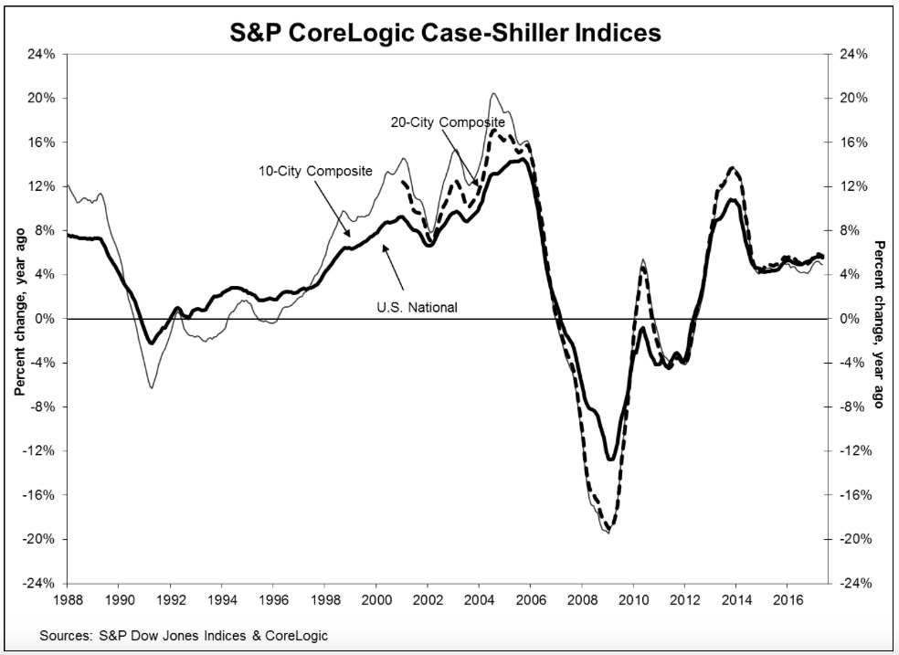 The S&P CoreLogic Case-Shiller U.S. National Home Price NSA Index, covering all nine U.S. census divisions, reported a 5.6% annual gain in May, the same as the prior month, S&P Dow Jones Indices reported Tuesday. The 10-City Composite annual increase came in at 4.9%, down from 5.0% the previous month. The 20-City Composite posted a 5.7% year-over-year gain, down from 5.8% in April.