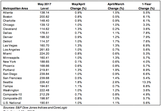 Seattle, Portland, and Denver reported the highest year-over-year gains among the 20 cities. In May, Seattle led the way with a 13.3% year-over-year price increase, followed by Portland with 8.9%, and Denver overtaking Dallas with a 7.9% increase. Nine cities reported greater price increases in the year ending May 2017 versus the year ending April 2017.