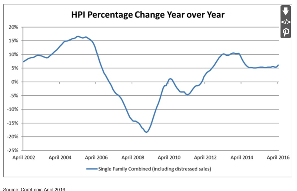 Separately, the company said its HPI Forecast predicted that home prices will rise another 5.3% from this April through April, 2017 and gain 0.9% from this April through May, 2016.