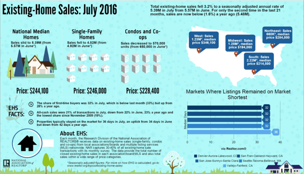 The median existing-home price for all housing types in July was $244,100, up 5.3% from July 2015 ($231,800). July’s price increase marks the 53rd consecutive month of year-over-year gains.