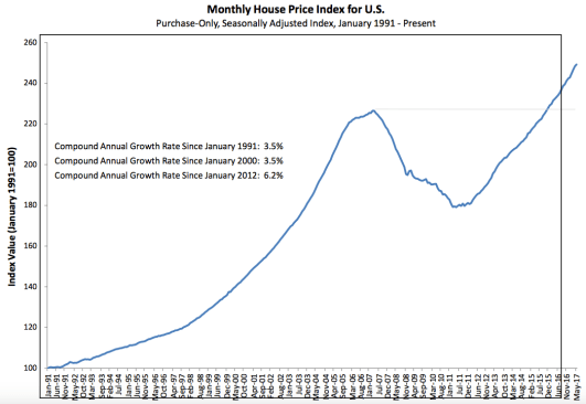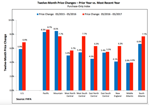 The FHFA monthly HPI is calculated using home sales price information from mortgages sold to, or guaranteed by, Fannie Mae and Freddie Mac. From May 2016 to May 2017, house prices were up 6.9%.
