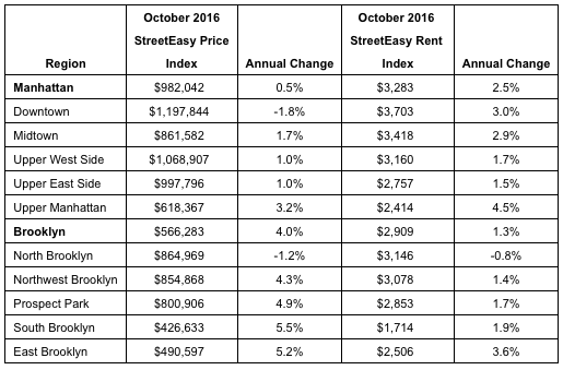 In Brooklyn and Manhattan, cooling competition is likely heralding a slower than usual winter season for the New York housing market, according to the October 2016 StreetEasy® Market Reports. Manhattan resale prices, while still increasing, are growing at their slowest pace in five years. In Brooklyn, competition is decreasing. In both boroughs, fewer homes went into contract last month than in October 2015.