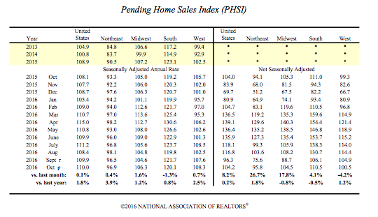 Pending home sales in October rose a scant 0.1% to a reading of 110.0 on the National Association of Realtors Pending Home Sales Index from a slight downward revision of 109.9 in September, the group reported Wednesday. With last month’s small increase, the index is now 1.8 percent higher than last October (108.1).