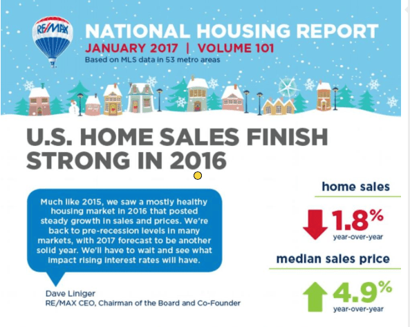 Add another voice to the chorus singing over the health of the housing market in 2016. RE/MAX says “2016 was the best year for U.S. home sales since the recession,” according to the its January 2017 National Housing Report.