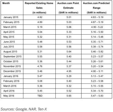 Ten-X, the real estate transaction marketplace and parent of auction.com, projects continued growth in existing home sales for May. According to the Ten-X Residential Real Estate Nowcast, May existing home sales will fall between seasonally adjusted annual rates of 5.47 and 5.83 million, with a targeted number of 5.65 million – a 3.7% increase from April and a 6.2% year-over-year gain.