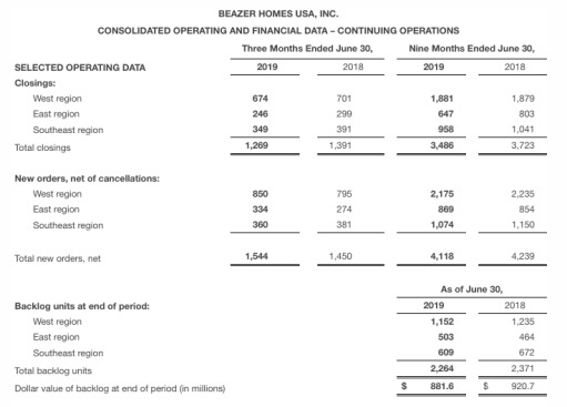 Beazer Homes USA, Inc., Atlanta (NYSE: BZH) after market close Thursday reported net income from continuing operations of $11.6 million, or $0.38 per share, for its fiscal third quarter ended June 30, compared to net income from continuing operations of $13.4 million, or $0.42 per share, in fiscal third quarter 2018. Analysts were expecting a gain of $0.17 per share.