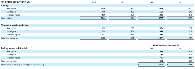 The dollar value of homes in backlog as of September 30, 2018 decreased 5.7% to $628.0 million, which compared to $665.8 million in the fourth quarter of fiscal 2017. The number of homes in backlog was 1,632 homes, down from 1,855 homes at the same time last year. The decrease in backlog units was partially offset by a 7.2% increase in the average selling price of homes in backlog to $384.8 thousand.