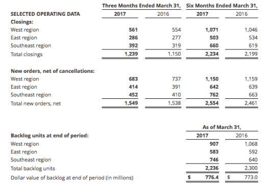 • Dollar value of homes in backlog of $776.4 million, up 0.4%, driven by an increase in the average selling price of homes in backlog of $347.2 thousand, up more than $11 thousand year-over-year