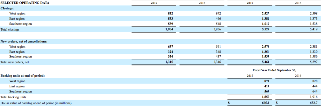 The dollar value of homes in backlog as of September 30, 2017 increased 2.0% to $665.8 million, or 1,855 homes, which compared to $652.7 million, or 1,916 homes, for the same period last year. The decrease in backlog units was more than offset by a 5.4% increase in the average selling price of homes in backlog to $358.9 thousand.