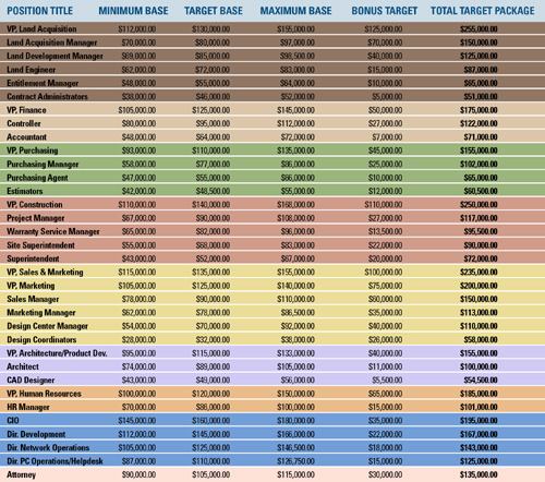 MONEY TALKS If people are truly your greatest asset, it’s time to put your money where your mouth is. Here is a list of middle-management salaries across nine departments integral to your big builder operations. Although salaries vary from market to market, this national snapshot provides a yardstick against which to measure your compensation packages. (For complete survey details, see Methodology Box, bottom of page.)