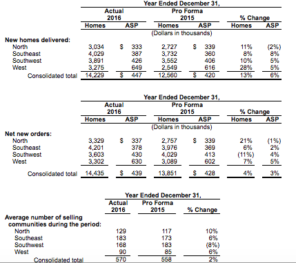 The dollar value of homes in backlog increased 4% to $2.7 billion, or 5,817 homes, compared to $2.6 billion, or 5,611 homes, for the 2015 fourth quarter, and decreased 20% compared to $3.3 billion, or 7,307 homes, for the 2016 third quarter. The increase in year-over-year backlog value was driven primarily by the 5% increase in the company’s monthly sales absorption rate. As of December 31, 2016, the average gross margin of the 5,817 total homes in backlog was 20.4%. For the 2,757 homes scheduled to close in the first quarter of 2017, the gross margin in backlog as of such date was 19.5%.