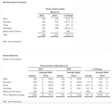 Dale Francescon, co-CEO, stated, “The first quarter ended significantly stronger than it started, where we experienced an overall stabilization in demand trends and better affordability, compared to relatively muted buyer activity in the latter half of 2018 which continued into the beginning of this year. Our focus remains on deepening our platform and driving additional operational efficiencies. Our concentration in markets with sound economic fundamentals combined with our lower price point product offerings throughout our business well positions us to deliver further earnings growth and generate enhanced returns for our stockholders.”