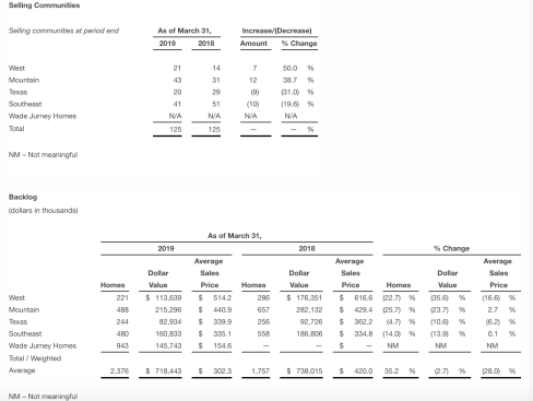 Net new home contracts in the first quarter 2019 increased 35% to a record 1,858 homes, compared to 1,377 homes in the prior year quarter, attributable to the addition of Wade Jurney Homes. At the end of the first quarter 2019, the company had 2,376 homes in backlog, an increase of 35% compared to 1,757 homes in backlog in the prior year quarter.